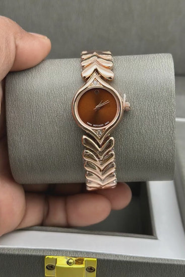 This exquisite women’s watch blends luxury and grace in a timeless design. Featuring a warm brown sunburst dial, it is beautifully framed by a rose-gold toned case with subtle crystal accents at the top and bottom, adding a refined sparkle. The minimalist dial design enhances its classy appeal, making it perfect for those who love understated elegance.